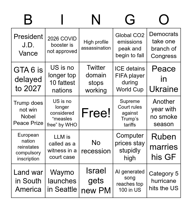 This bingo card has a free space and 24 words: LLM is called as a witness in a court case, Waymo launches in Seattle, Twitter domain stops working, Land war in South America, Democrats take one branch of Congress, President J.D. Vance, GTA 6 is delayed to 2027, 2026 COVID booster is not approved, Supreme Court rules against Trump’s tariffs, No recession, ICE detains FIFA player during World Cup, Trump does not win Nobel Peace Prize, Computer prices stay stupidly high, Ruben marries his GF, US is no longer top 10 fattest nations, AI generated song reaches top 100 in US, Another year with no smoke season, High profile assassination, Peace in Ukraine, US is no longer considered “measles free” by WHO, Category 5 hurricane hits the US, European nation reinstates compulsory inscription, Global CO2 emissions peak and begin to fall and Israel gets new PM.