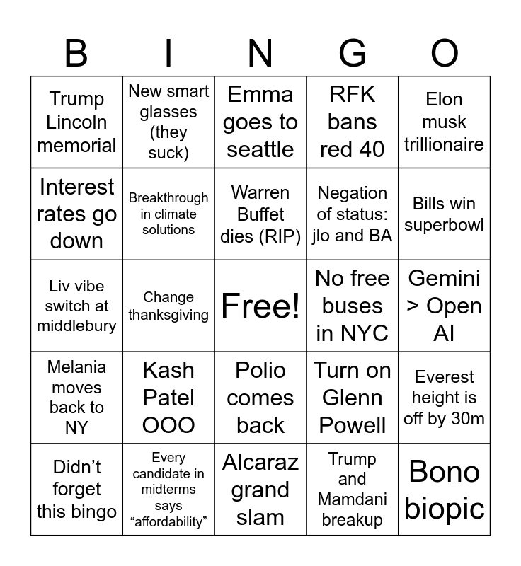 This bingo card has a free space and 24 words: Kash Patel OOO, Every candidate in midterms says “affordability”, Warren Buffet dies (RIP), Didn’t forget this bingo, Elon musk trillionaire, Trump Lincoln memorial, Interest rates go down, New smart glasses (they suck), No free buses in NYC, Polio comes back, Negation of status: jlo and BA, Liv vibe switch at middlebury, Turn on Glenn Powell, Everest height is off by 30m, Breakthrough in climate solutions, Trump and Mamdani breakup, Gemini > Open AI, Emma goes to seattle, Bills win superbowl, Change thanksgiving, Bono biopic, Melania moves back to NY, RFK bans red 40 and Alcaraz grand slam.