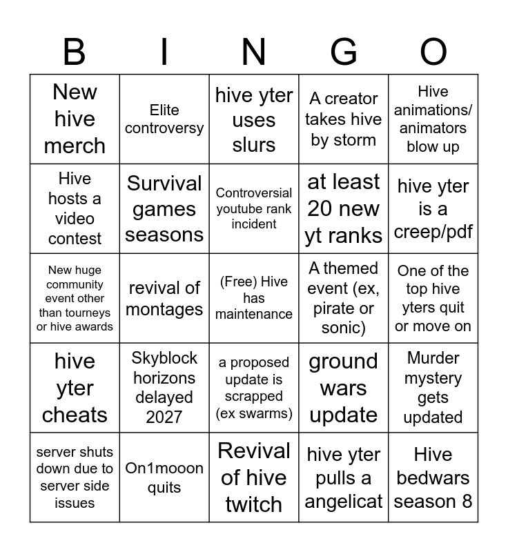 This bingo card has a free space and 24 words: Skyblock horizons delayed 2027, On1mooon quits, Controversial youtube rank incident, server shuts down due to server side issues, Hive animations/ animators blow up, New hive merch, Hive hosts a video contest, Elite controversy, A themed event (ex, pirate or sonic), a proposed update is scrapped (ex swarms), at least 20 new yt ranks, New huge community event other than tourneys or hive awards, ground wars update, Murder mystery gets updated, Survival games seasons, hive yter pulls a angelicat, One of the top hive yters quit or move on, hive yter uses slurs, hive yter is a creep/pdf, revival of montages, Hive bedwars season 8, hive yter cheats, A creator takes hive by storm and Revival of hive twitch.