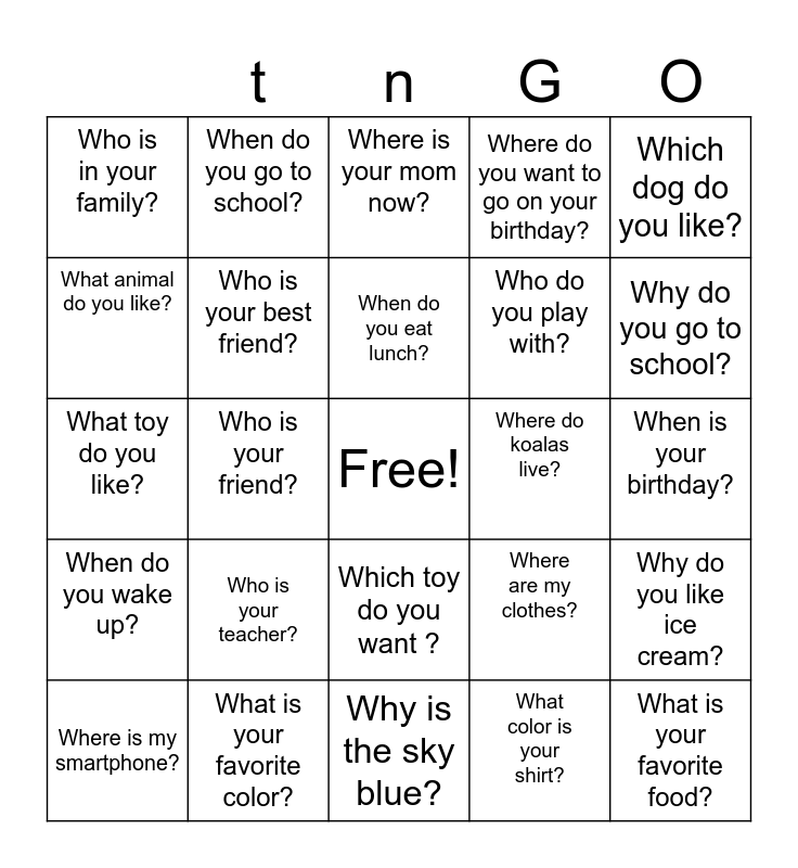 This bingo card has a free space and 24 words: Who is your teacher?, What is your favorite color?, When do you eat lunch?, Where is my smartphone?, Which dog do you like?, Who is in your family?, What animal do you like?, When do you go to school?, Where do koalas live?, Which toy do you want ?, Who do you play with?, What toy do you like?, Where are my clothes?, Why do you like ice cream?, Who is your best friend?, What color is your shirt?, When is your birthday?, Where is your mom now?, Why do you go to school?, Who is your friend?, What is your favorite food?, When do you wake up?, Where do you want to go on your birthday? and Why is the sky blue?.