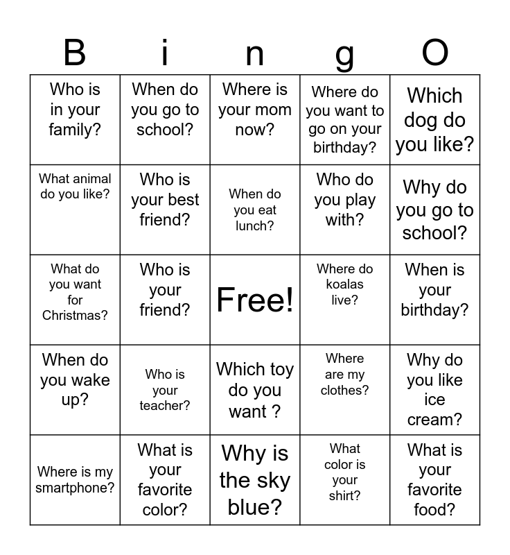 This bingo card has a free space and 24 words: Who is your teacher?, What is your favorite color?, When do you eat lunch?, Where is my smartphone?, Which dog do you like?, Who is in your family?, What animal do you like?, When do you go to school?, Where do koalas live?, Which toy do you want ?, Who do you play with?, What do you want for Christmas?, Where are my clothes?, Why do you like ice cream?, Who is your best friend?, What color is your shirt?, When is your birthday?, Where is your mom now?, Why do you go to school?, Who is your friend?, What is your favorite food?, When do you wake up?, Where do you want to go on your birthday? and Why is the sky blue?.