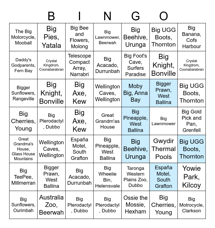 This bingo card has a free space and 143 words: Big Sunflowers, Ourimbah, Big Prawn, Crangan Bay, Big Pine Cones, Caves Beach, Ossie the Mossie, Hexham, Big UGG Boots, Thornton, Moby Big, Anna Bay, Bakker's Big Peach, Anna Bay, Big Red Bug, Salt Ash, Daddy's Godparents, Fern Bay, Big Bass, Bulahdelah, Bulahdelah Motor Lodge, Elmo's Corner, Kuruah, Big Motorcycle, Clarkson, Big Axe, Kew, Big Bow & Arrow, Lake Inness, Trial Bay Gaol, Big Beehive, Urunga, Big Knight, Bonville, Big Cloggs, Coffs Harbour, Big Banana, Cofs Harbour, España Motel, South Grafton, Bigger Prawn, West Ballina, Big Pineapple, West Ballina, The Big Motorcycle, Mooball, Big Acacado, Durrunbah, Big Foot's Cave, Surfers Paradise, Big Pies, Yatala, Big Wheelie Bin, Helensvale, Big Strawberry, Elimbah, Great Grandma's House, Big Lawnmower, Australia Zoo,, Yowie Park, Kilcoy, Bigger Sunflowers, Rangeville, Big TeePee, Millmerran, Gwydir Thermal Pools, Telescope Compact Array, Narrabri, Jupiter Virtual Solar System, Coonabarabran, Crystal Kingdrom, Coonabarabran, Taronga Western Plains Zoo, Dubbo, Big Pterodactyl , Dubbo, Wellington Caves Holiday Park, Wellington Caves, Wellington, Big Bee and Flowers, Molong, Big Gold Pick and Pan, Grenfell, Big Cherries, Young, Don Bradman's Bat & Stumps, Cootamundra, The Giant, Cootamundra, Big Sunflowers, Ourimbah, Big Prawn, Crangan Bay, Big Pine Cones, Caves Beach, Ossie the Mossie, Hexham, Big UGG Boots, Thornton, Moby Big, Anna Bay, Bakker's Big Peach, Anna Bay, Big Red Bug, Salt Ash, Daddy's Godparents, Fern Bay, Big Bass, Bulahdelah, Bulahdelah Motor Lodge, Elmo's Corner, Kuruah, Big Motrocycle, Clarkson, Big Axe, Kew, Big Bow & Arrow, Lake Inness, Trial Bay Gaol, Big Beehive, Urunga, Big Knight, Bonville, Big Cloggs, Coffs Harbour, Big Banana, Cofs Harbour, España Motel, South Grafton, Bigger Prawn, West Ballina, Big Pineapple, West Ballina, The Big Motorcycle, Mooball, Big Acacado, Durrunbah, Big Foot's Cave, Surfers Paradise, Big Pies, Yatala, Big Wheelie Bin, Helensvale, Big Strawberry, Elimbah, Great Grandma's House, Glass House Mountains, Big Lawnmower, Beerwah, Australia Zoo, Beerwah, Yowie Park, Kilcoy, Bigger Sunflowers, Rangeville, Big TeePee, Millmerran, Gwydir Thermal Pools, Telescope Compact Array, Narrabri, Jupiter Virtual Solar System, Coonabarabran, Crystal Kingdrom, Coonabarabran, Taronga Western Plains Zoo, Dubbo, Big Pterodactyl , Dubbo, Wellington Caves Holiday Park, Wellington Caves, Wellington, Big Bee and Flowers, Molong, Big Gold Pick and Pan, Grenfell, Big Cherries, Young, Don Bradman's Bat & Stumps, Cootamundra, The Giant, Cootamundra, Big Sunflowers, Ourimbah, Big Prawn, Crangan Bay, Big Pine Cones, Caves Beach, Ossie the Mossie, Hexham, Big UGG Boots, Thornton, Moby Big, Anna Bay, Bakker's Big Peach, Anna Bay, Big Red Bug, Salt Ash, Daddy's Godparents, Fern Bay, Big Bass, Bulahdelah, Bulahdelah Motor Lodge, Elmo's Corner, Kuruah, Big Motrocycle, Clarkson, Big Axe, Kew, Big Bow & Arrow, Lake Inness, Trial Bay Gaol, Big Beehive, Urunga, Big Knight, Bonville, Big Cloggs, Coffs Harbour, Big Banana, Cofs Harbour, España Motel, South Grafton, Bigger Prawn, West Ballina, Big Pineapple, West Ballina, The Big Motorcycle, Mooball, Big Acacado, Durrunbah, Big Foot's Cave, Surfers Paradise, Big Pies, Yatala, Big Wheelie Bin, Helensvale, Big Strawberry, Elimbah, Big Lawnmower, Beerwah, Australia Zoo, Beerwah, Yowie Park, Kilcoy, Bigger Sunflowers, Rangeville, Big TeePee, Millmerran, Gwydir Thermal Pools, Telescope Compact Array, Narrabri, Jupiter Virtual Solar System, Coonabarabran, Crystal Kingdrom, Coonabarabran, Taronga Western Plains Zoo, Dubbo, Big Pterodactyl , Dubbo, Wellington Caves Holiday Park, Wellington Caves, Wellington, Big Bee and Flowers, Molong, Big Gold Pick and Pan, Grenfell, Big Cherries, Young, Don Bradman's Bat & Stumps, Cootamundra and The Giant, Cootamundra.