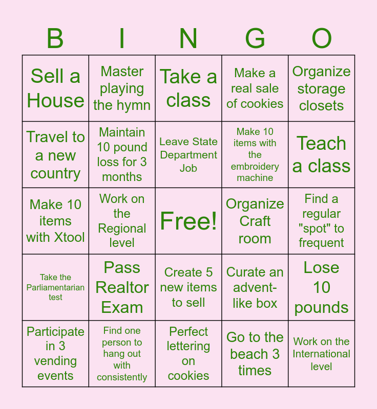 This bingo card has a free space and 24 words: Pass Realtor Exam, Find one person to hang out with consistently, Leave State Department Job, Participate in 3 vending events, Organize storage closets, Sell a House, Travel to a new country, Master playing the hymn, Organize Craft room, Create 5 new items to sell, Make 10 items with the embroidery machine, Make 10 items with Xtool, Curate an advent-like box, Lose 10 pounds, Maintain 10 pound loss for 3 months, Go to the beach 3 times, Find a regular "spot" to frequent, Take a class, Teach a class, Work on the Regional level, Work on the International level, Take the Parliamentarian test, Make a real sale of cookies and Perfect lettering on cookies.