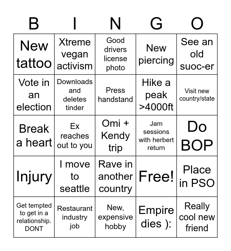 This bingo card has 25 words: I move to seattle, New, expensive hobby, Press handstand, Get tempted to get in a relationship. DONT, See an old suoc-er, New tattoo, Vote in an election, Xtreme vegan activism, Jam sessions with herbert return, Rave in another country, Hike a peak >4000ft, Break a heart, Free!, Place in PSO, Downloads and deletes tinder, Really cool new friend, Do BOP, Good drivers license photo, Visit new country/state, Ex reaches out to you, Omi + Kendy trip, Restaurant industry job, Injury, New piercing and Empire dies ):.