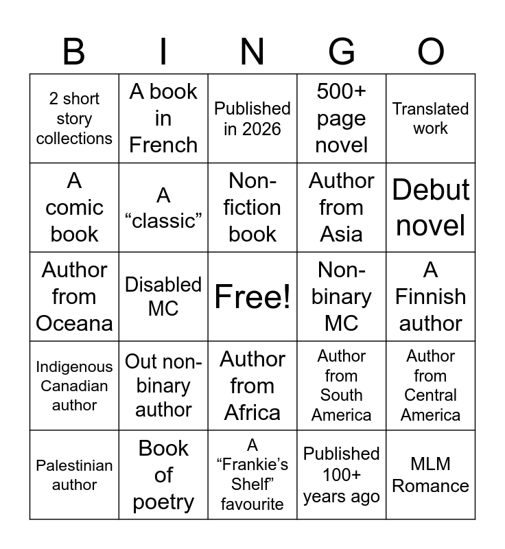 This bingo card has a free space and 24 words: Out non-binary author, Book of poetry, Non-fiction book, Palestinian author, Translated work, 2 short story collections, A comic book, A book in French, Non-binary MC, Author from Africa, Author from Asia, Author from Oceana, Author from South America, Author from Central America, A “classic”, Published 100+ years ago, A Finnish author, Published in 2026, Debut novel, Disabled MC, MLM Romance, Indigenous Canadian author, 500+ page novel and A “Frankie’s Shelf” favourite.