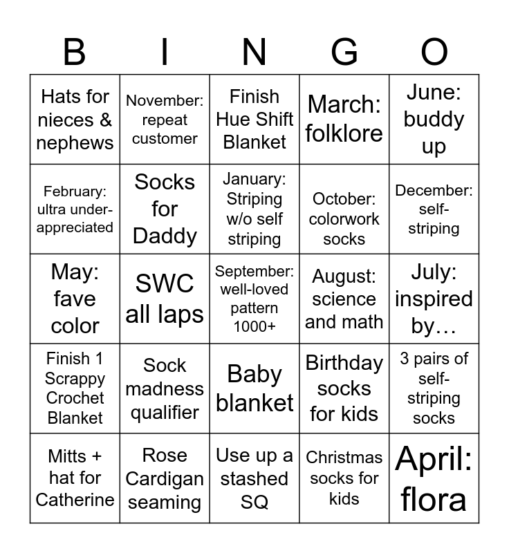 This bingo card has a free space and 24 words: Sock madness qualifier, Rose Cardigan seaming, January: Striping w/o self striping, Mitts + hat for Catherine, June: buddy up, Hats for nieces & nephews, February: ultra under-appreciated, November: repeat customer, August: science and math, Baby blanket, October: colorwork socks, May: fave color, Birthday socks for kids, 3 pairs of self-striping socks, Socks for Daddy, Christmas socks for kids, July: inspired by…, Finish Hue Shift Blanket, December: self-striping, SWC all laps, April: flora, Finish 1 Scrappy Crochet Blanket, March: folklore and Use up a stashed SQ.