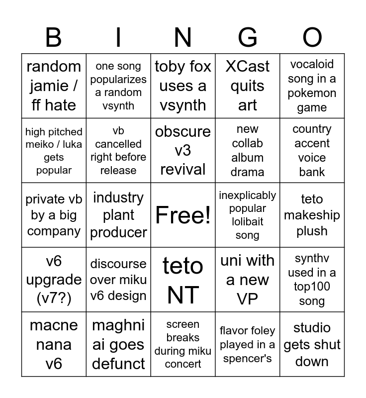 This bingo card has a free space and 24 words: discourse over miku v6 design, maghni ai goes defunct, obscure v3 revival, macne nana v6, vocaloid song in a pokemon game, random jamie / ff hate, high pitched meiko / luka gets popular, one song popularizes a random vsynth, inexplicably popular lolibait song, teto NT, new collab album drama, private vb by a big company, uni with a new VP, synthv used in a top100 song, vb cancelled right before release, flavor foley played in a spencer's, teto makeship plush, toby fox uses a vsynth, country accent voice bank, industry plant producer, studio gets shut down, v6 upgrade (v7?), XCast quits art and screen breaks during miku concert.