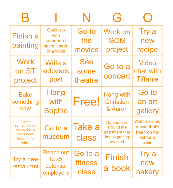 This bingo card has a free space and 24 words: Go to a museum, Reach out to x5 potential employers, See some theatre, Try a new restaurant, Try a new recipe, Finish a painting, Work on ST project, Catch up with someone I haven't seen in a while, Hang with Christian & Aaron, Take a class, Go to a concert, Bake something new, Do one task around the apartment that keeps getting avoided, Watch an old movie that's been on my list for a while, Write a substack post, Finish a book, Go to an art gallery, Go to the movies, Video chat with Tiffanie, Hang with Sophie, Try a new bakery, Knock something off the to do list that's been there for a while, Work on GOM project and Go to a fitness class.