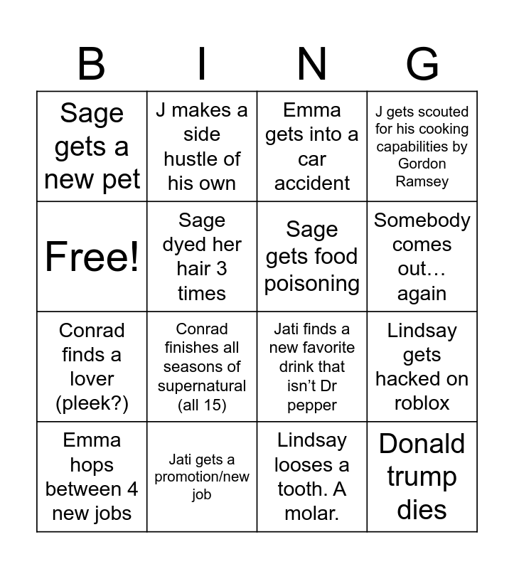 This bingo card has 16 words: Jati gets a promotion/new job, Lindsay gets hacked on roblox, Emma gets into a car accident, Sage gets a new pet, Conrad finds a lover (pleek?), J makes a side hustle of his own, Jati finds a new favorite drink that isn’t Dr pepper, Lindsay looses a tooth. A molar., Free!, Sage dyed her hair 3 times, Emma hops between 4 new jobs, J gets scouted for his cooking capabilities by Gordon Ramsey, Conrad finishes all seasons of supernatural (all 15), Somebody comes out… again, Sage gets food poisoning and Donald trump dies.