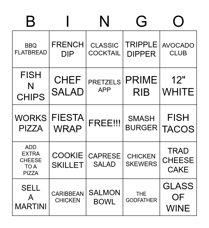 This bingo card has a free space and 24 words: COOKIE SKILLET, CARIBBEAN CHICKEN, PRETZELS APP, SELL A MARTINI, AVOCADO CLUB, BBQ FLATBREAD, FISH N CHIPS, FRENCH DIP, SMASH BURGER, CAPRESE SALAD, PRIME RIB, WORKS PIZZA, CHICKEN SKEWERS, TRAD CHEESE CAKE, CHEF SALAD, THE GODFATHER, FISH TACOS, CLASSIC COCKTAIL, 12" WHITE, FIESTA WRAP, GLASS OF WINE, ADD EXTRA CHEESE TO A PIZZA, TRIPPLE DIPPER and SALMON BOWL.