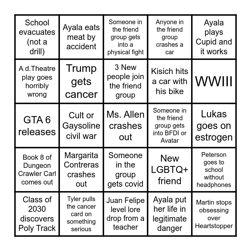 This bingo card has 70 words: Kisich gets in a relationship, Lukas goes on estrogen, Someone sees Mr. Stern in the wild, 5+ people Colin house raid, Tyler pulls the cancer card on something serious, 2 people get buzz cuts this year, Anyone in the friend group crashes a car, Anyone goes to the hospital for 2+ days, Ayala plays Cupid and it works, Any Alex gets an F7 completion, Peterson goes to school without headphones, Nepal goes into civil war, School evacuates (not a drill), Someone in the friend group gets into a physical fight, A widely hated teacher gets fired, Cult or Gaysoline civil war, Someone in the group gets covid, Kisich hits a car with his bike, Kisich wears anything gay to school, Book 8 of Dungeon Crawler Carl comes out, Someone in the friend group gets into BFDI or Avatar, New LGBTQ+ friend, WWIII, Music artist that someone in the friend group listens to is a murderer, Any Alex house raid, Oliver gets a clippable PvP kill, Any Alex gets the police at their door, Straight guy dyes their hair for the first time, Ayala put her life in legitimate danger, Ayala forgets Peterson is bisexual, Ayala eats meat by accident, Someone gets stuck in a foreign country, A pool day happens, A Great America day happens, Oliver changes any of his profile pictures to not be a bird, Evan comes to a house raid, Colin baptizes somebody, Any LGBTQ+ friend gets called the F slur in public, Anyone in the friend group has a massive crashout, A d.Theatre play goes horribly wrong, Martin stops obsessing over Heartstopper, Margarita Contreras crashes out, Ms. Allen crashes out, The Chiefs win the Super Bowl, Ayala crashes her bike, Trump gets cancer, Class of 2030 discovers Poly Track, Mr. Felipe makes a racist joke, We play with legos, Colin wear high heels, Colin runs into someone with a free skate, Frankenboard breaks, Two people in the friend group get in a relationship, Anyone finds a stray plastic baby leg, Juan Felipe level lore drop from a teacher, Someone at d.Tech gets expelled, 3 New people join the friend group, Colin shows up to school without Nirvana merch, Someone in the friend group fatally breaks their school computer, The Great Gaslamp actually happens, GTA 6 releases, Song of the summer is widely hated in the friend group, Trump’s presidency ends, Someone in the friend group gets in big trouble with administration, The Project Hail Mary movie is good, The Super Mario Galaxy movie is good, Colinism gets official religious practices, A heated argument about politics or religion in the friend group, The d.Wall gets built and Asher gets his hair back.