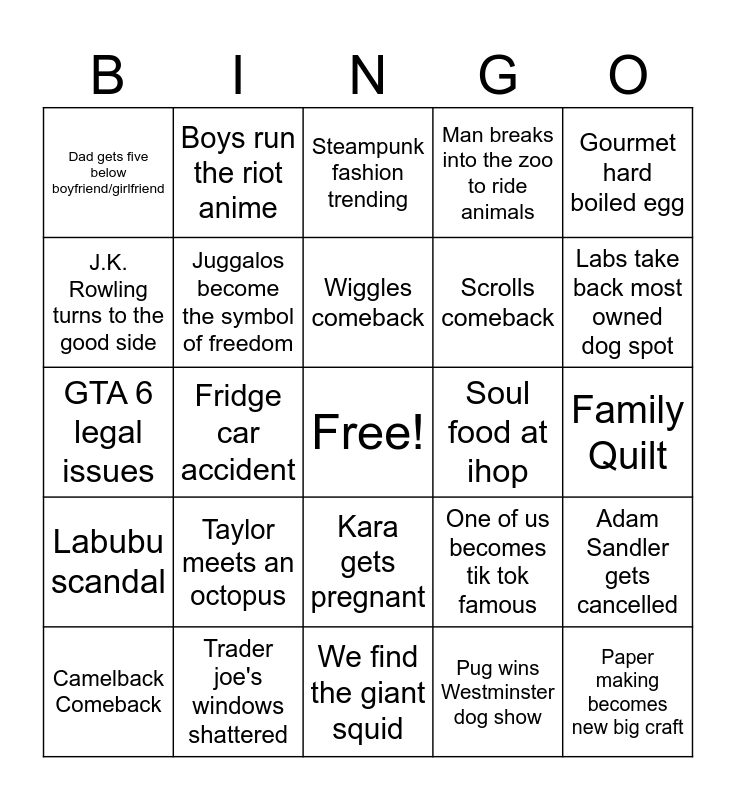 This bingo card has a free space and 24 words: Taylor meets an octopus, Trader joe's windows shattered, Wiggles comeback, Camelback Comeback, Gourmet hard boiled egg, Dad gets five below boyfriend/girlfriend, J.K. Rowling turns to the good side, Boys run the riot anime, Soul food at ihop, Kara gets pregnant, Scrolls comeback, GTA 6 legal issues, One of us becomes tik tok famous, Adam Sandler gets cancelled, Juggalos become the symbol of freedom, Pug wins Westminster dog show, Family Quilt, Steampunk fashion trending, Labs take back most owned dog spot, Fridge car accident, Paper making becomes new big craft, Labubu scandal, Man breaks into the zoo to ride animals and We find the giant squid.