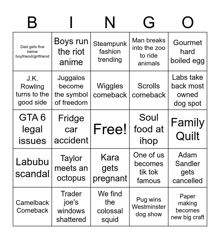 This bingo card has a free space and 24 words: Taylor meets an octopus, Trader joe's windows shattered, Wiggles comeback, Camelback Comeback, Gourmet hard boiled egg, Dad gets five below boyfriend/girlfriend, J.K. Rowling turns to the good side, Boys run the riot anime, Soul food at ihop, Kara gets pregnant, Scrolls comeback, GTA 6 legal issues, One of us becomes tik tok famous, Adam Sandler gets cancelled, Juggalos become the symbol of freedom, Pug wins Westminster dog show, Family Quilt, Steampunk fashion trending, Labs take back most owned dog spot, Fridge car accident, Paper making becomes new big craft, Labubu scandal, Man breaks into the zoo to ride animals and We find the colossal squid.