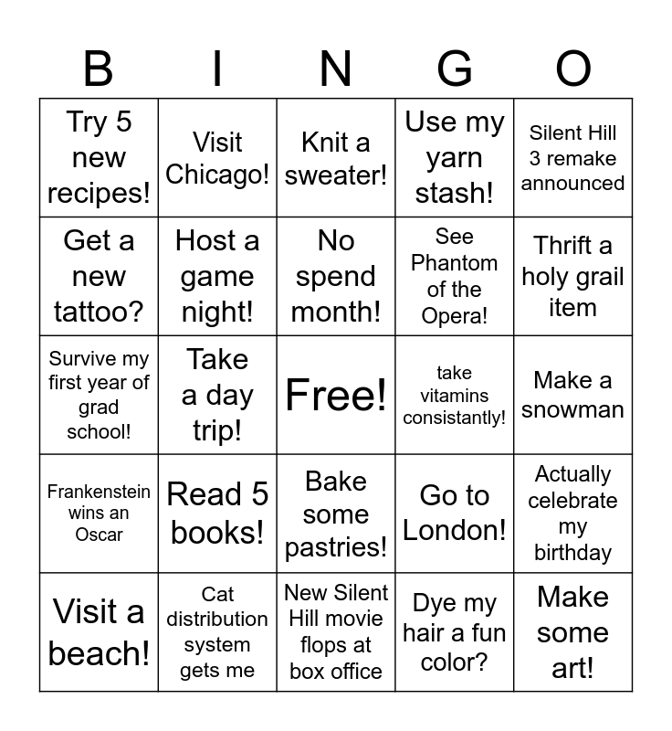 This bingo card has a free space and 24 words: Visit a beach!, Read 5 books!, No spend month!, Dye my hair a fun color?, Silent Hill 3 remake announced, Try 5 new recipes!, Visit Chicago!, Knit a sweater!, take vitamins consistantly!, Make a snowman, Survive my first year of grad school!, Host a game night!, Go to London!, Actually celebrate my birthday, Get a new tattoo?, Cat distribution system gets me, New Silent Hill movie flops at box office, Use my yarn stash!, Thrift a holy grail item, Frankenstein wins an Oscar, Take a day trip!, Bake some pastries!, See Phantom of the Opera! and Make some art!.