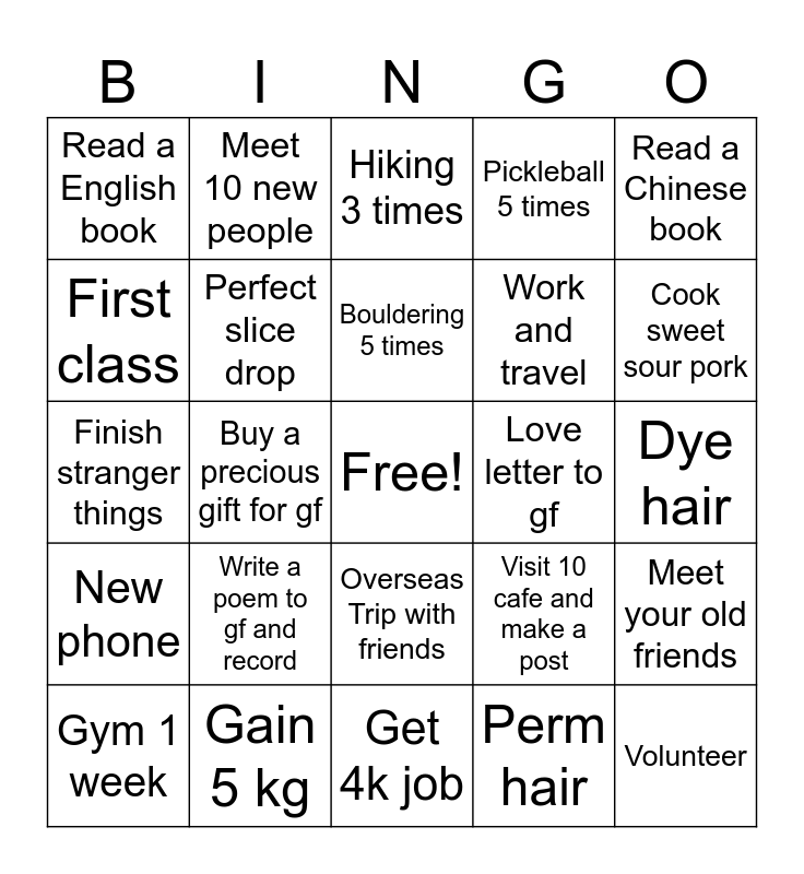 This bingo card has a free space and 24 words: Write a poem to gf and record, Gain 5 kg, Bouldering 5 times, Gym 1 week, Read a Chinese book, Read a English book, First class, Meet 10 new people, Love letter to gf, Overseas Trip with friends, Work and travel, Finish stranger things, Visit 10 cafe and make a post, Meet your old friends, Perfect slice drop, Perm hair, Dye hair, Hiking 3 times, Cook sweet sour pork, Buy a precious gift for gf, Volunteer, New phone, Pickleball 5 times and Get 4k job.