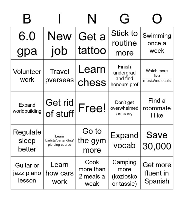 This bingo card has a free space and 24 words: Learn barista/bartending/ piercing course, Learn how cars work, Learn chess, Guitar or jazz piano lesson, Swimming once a week, 6.0 gpa, Volunteer work, New job, Don’t get overwhelmed as easy, Go to the gym more, Finish undergrad and find honours prof, Expand worldbuilding, Expand vocab, Save 30,000, Travel pverseas, Camping more (koziosko or tassie), Find a roommate I like, Get a tattoo, Watch more live music/musicals, Get rid of stuff, Get more fluent in Spanish, Regulate sleep better, Stick to routine more and Cook more than 2 meals a weak.