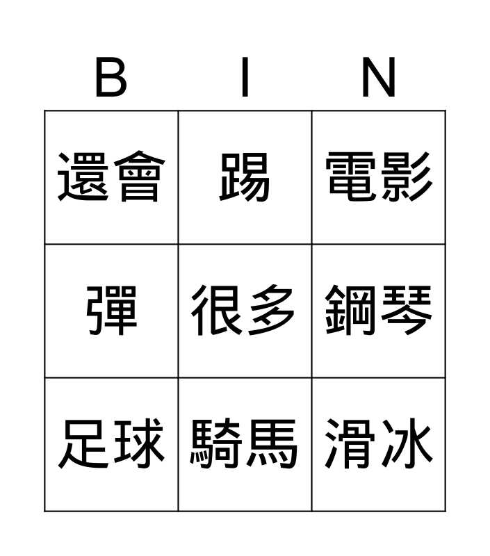 This bingo card has a free space and 11 words: 愛好, 騎馬, 滑冰, 足球, 踢, 電影, 鋼琴, 看, 彈, 還會 and 喜歡.