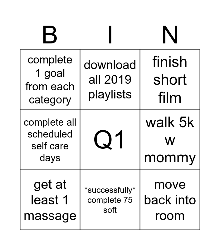 This bingo card has a free space and 8 words: walk 5k w mommy, finish short film, download all 2019 playlists, get at least 1 massage, complete 1 goal from each category, move back into room, complete all scheduled self care days and *successfully* complete 75 soft.