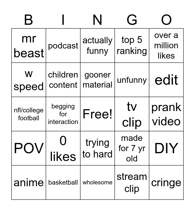 This bingo card has a free space and 24 words: 0 likes, basketball, gooner material, anime, over a million likes, mr beast, w speed, podcast, tv clip, trying to hard, unfunny, nfl/college football, made for 7 yr old, DIY, children content, stream clip, prank video, actually funny, edit, begging for interaction, cringe, POV, top 5 ranking and wholesome.