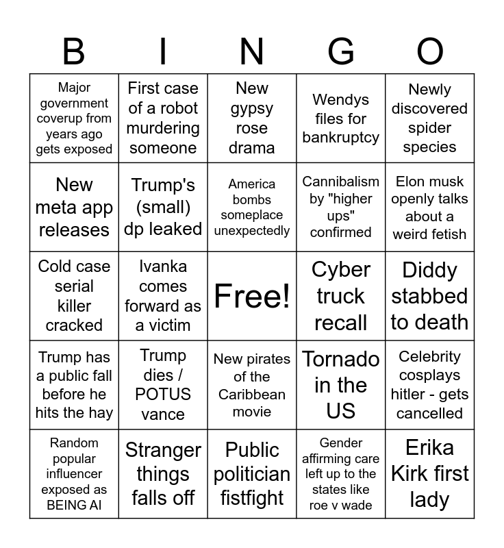 This bingo card has a free space and 24 words: Trump dies / POTUS vance, Stranger things falls off, America bombs someplace unexpectedly, Random popular influencer exposed as BEING AI, Newly discovered spider species, Major government coverup from years ago gets exposed, New meta app releases, First case of a robot murdering someone, Cyber truck recall, New pirates of the Caribbean movie, Cannibalism by "higher ups" confirmed, Cold case serial killer cracked, Tornado in the US, Celebrity cosplays hitler - gets cancelled, Trump's (small) dp leaked, Gender affirming care left up to the states like roe v wade, Diddy stabbed to death, New gypsy rose drama, Elon musk openly talks about a weird fetish, Ivanka comes forward as a victim, Erika Kirk first lady, Trump has a public fall before he hits the hay, Wendys files for bankruptcy and Public politician fistfight.