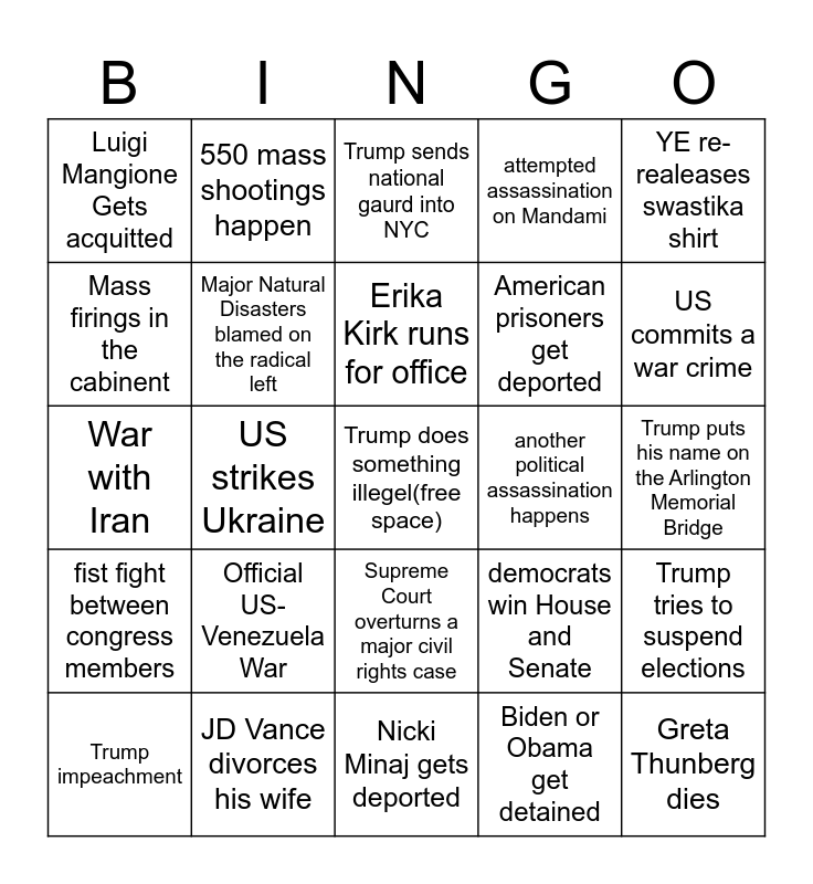 This bingo card has a free space and 24 words: Official US-Venezuela War, JD Vance divorces his wife, Erika Kirk runs for office, Trump impeachment, YE re-realeases swastika shirt, Luigi Mangione Gets acquitted, Mass firings in the cabinent, 550 mass shootings happen, another political assassination happens, Supreme Court overturns a major civil rights case, American prisoners get deported, War with Iran, democrats win House and Senate, Trump tries to suspend elections, Major Natural Disasters blamed on the radical left, Biden or Obama get detained, Trump puts his name on the Arlington Memorial Bridge, Trump sends national gaurd into NYC, US commits a war crime, US strikes Ukraine, Greta Thunberg dies, fist fight between congress members, attempted assassination on Mandami and Nicki Minaj gets deported.
