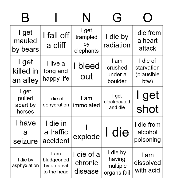 This bingo card has 25 words: I die in a traffic accident, I die of a chronic disease, I bleed out, I die by asphyxiation, I die from a heart attack, I get mauled by bears, I get killed in an alley, I fall off a cliff, I get electrocuted and die, I explode, I am crushed under a boulder, I get pulled apart by horses, I die, I die from alcohol poisoning, I live a long and happy life, I am dissolved with acid, I get shot, I get trampled by elephants, I die of starvation (plausible btw), I die of dehydration, I am immolated, I am bludgeoned by an anvil to the head, I have a seizure, I die by radiation and I die by having multiple organs fail.