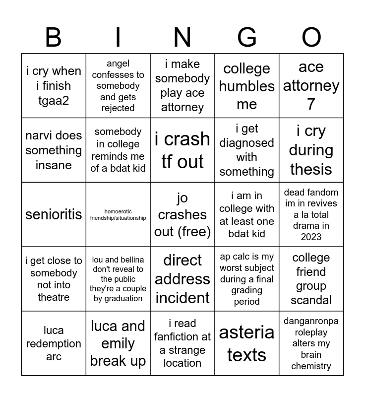 This bingo card has a free space and 24 words: lou and bellina don't reveal to the public they're a couple by graduation, luca and emily break up, i crash tf out, luca redemption arc, ace attorney 7, i cry when i finish tgaa2, narvi does something insane, angel confesses to somebody and gets rejected, i am in college with at least one bdat kid, direct address incident, i get diagnosed with something, senioritis, ap calc is my worst subject during a final grading period, college friend group scandal, somebody in college reminds me of a bdat kid, asteria texts, dead fandom im in revives a la total drama in 2023, i make somebody play ace attorney, i cry during thesis, homoerotic friendship/situationship, danganronpa roleplay alters my brain chemistry, i get close to somebody not into theatre, college humbles me and i read fanfiction at a strange location.