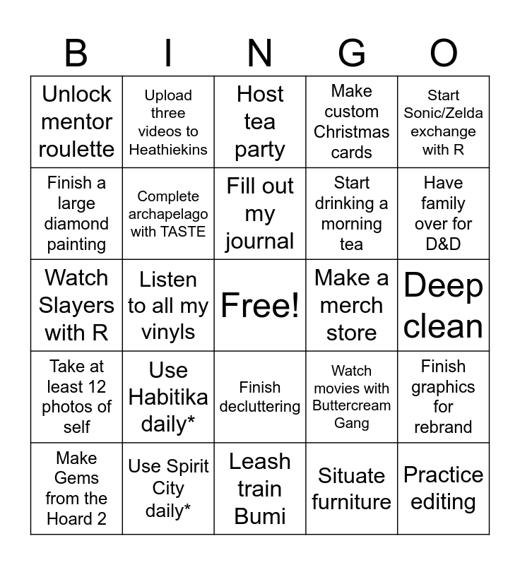 This bingo card has a free space and 24 words: Use Habitika daily*, Use Spirit City daily*, Fill out my journal, Make Gems from the Hoard 2, Start Sonic/Zelda exchange with R, Unlock mentor roulette, Finish a large diamond painting, Upload three videos to Heathiekins, Make a merch store, Finish decluttering, Start drinking a morning tea, Watch Slayers with R, Watch movies with Buttercream Gang, Finish graphics for rebrand, Complete archapelago with TASTE, Situate furniture, Deep clean, Host tea party, Have family over for D&D, Listen to all my vinyls, Practice editing, Take at least 12 photos of self, Make custom Christmas cards and Leash train Bumi.