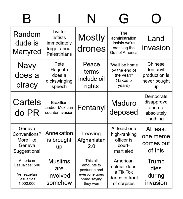 This bingo card has a free space and 24 words: Annexation is brought up, Muslims are involved somehow, Peace terms include oil rights, American Casualties: 500 Venezuelan Casualties: 1,000,000, Land invasion, Random dude is Martyred, Navy does a piracy, Twitter leftists immediately forget about Palestinians, Maduro deposed, Leaving Afghanistan 2.0, "We'll be home by the end of the year!" (Takes 5 years), Cartels do PR, At least one high-ranking officer is court-martialed, At least one meme comes out of this, Pete Hegseth does a dickswinging speech, American soldier does a Tik Tok dance in front of corpses, Democrats disapprove and do absolutely nothing, Mostly drones, Chinese fentanyl production is never bought up, Brazillian and/or Mexican counterinvasion, Trump dies during invasion, Geneva Conventions? More like Geneva Suggestions!, The administration insists we're crossing the Gulf of America and This all amounts to posturing and everyone goes home saying they won.