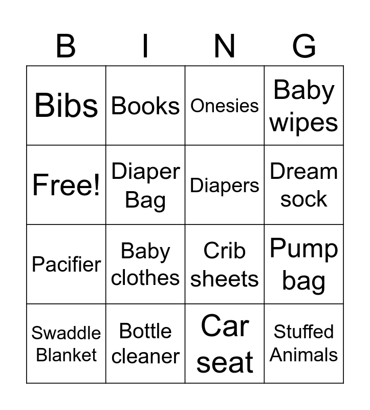 This bingo card has 16 words: Bottle cleaner, Pump bag, Onesies, Bibs, Pacifier, Books, Crib sheets, Car seat, Free!, Diaper Bag, Swaddle Blanket, Baby wipes, Baby clothes, Dream sock, Diapers and Stuffed Animals.