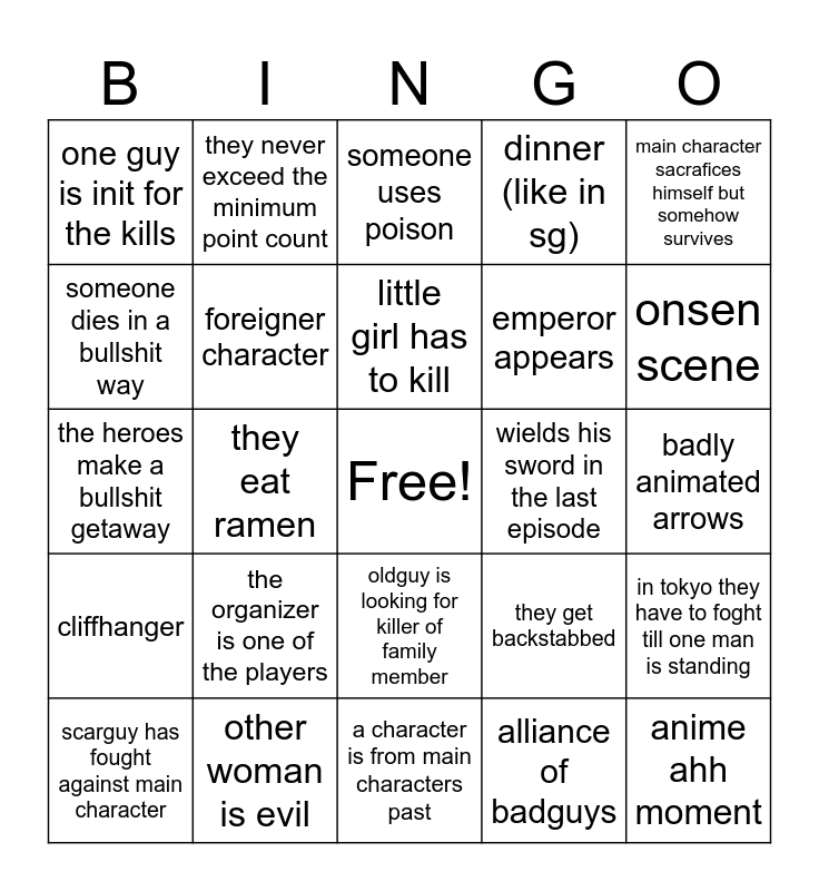 This bingo card has a free space and 24 words: the organizer is one of the players, other woman is evil, little girl has to kill, scarguy has fought against main character, main character sacrafices himself but somehow survives, one guy is init for the kills, someone dies in a bullshit way, they never exceed the minimum point count, wields his sword in the last episode, oldguy is looking for killer of family member, emperor appears, the heroes make a bullshit getaway, they get backstabbed, in tokyo they have to foght till one man is standing, foreigner character, alliance of badguys, badly animated arrows, someone uses poison, onsen scene, they eat ramen, anime ahh moment, cliffhanger, dinner (like in sg) and a character is from main characters past.