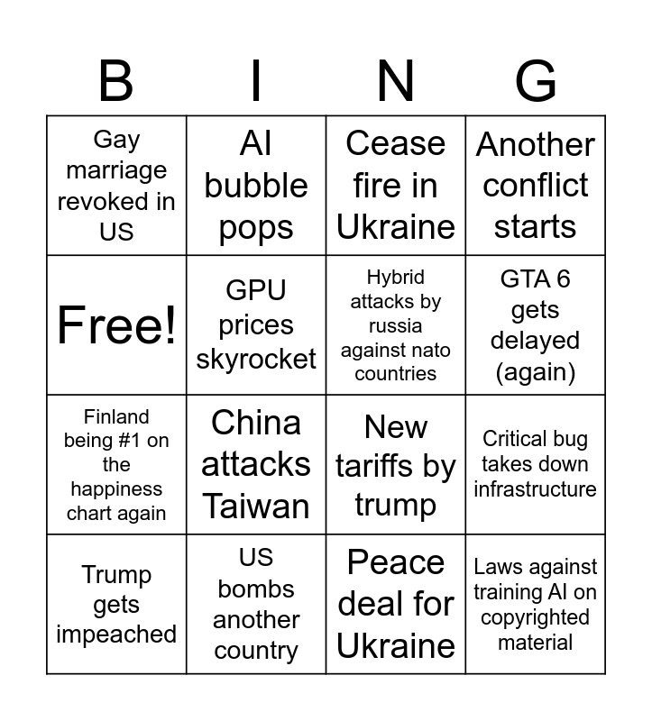 This bingo card has 16 words: US bombs another country, Critical bug takes down infrastructure, Cease fire in Ukraine, Gay marriage revoked in US, Finland being #1 on the happiness chart again, AI bubble pops, New tariffs by trump, Peace deal for Ukraine, Free!, GPU prices skyrocket, Trump gets impeached, Another conflict starts, China attacks Taiwan, GTA 6 gets delayed (again), Hybrid attacks by russia against nato countries and Laws against training AI on copyrighted material.