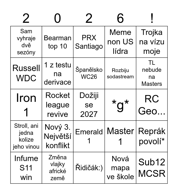 This bingo card has a free space and 24 words: Nový 3. Největší konflikt, Změna vlajky africké země, Španělsko WC26, Infume S11 win, Trojka na vízu moje, Sam vyhraje dvě sezóny, Russell WDC, Bearman top 10, *g*, Emerald 1, Rozbiju sodastream, Iron 1, Master 1, Reprák povolí*, 1 z testu na derivace, Nová mapa ve škole, RC Geo..., PRX Santiago, TL nebude na Masters, Rocket league revive, Sub12 MCSR, Stroll, ani jedna kolize jeho vinou, Meme non US lídra and Řidičák:).