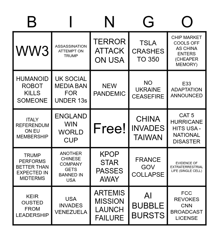This bingo card has a free space and 24 words: ANOTHER CHINESE COMPANY GETS BANNED IN USA, USA INVADES VENEZUELA, NEW PANDEMIC, KEIR OUSTED FROM LEADERSHIP, CHIP MARKET COOLS OFF AS CHINA ENTERS (CHEAPER MEMORY), WW3, HUMANOID ROBOT KILLS SOMEONE, ASSASSINATION ATTEMPT ON TRUMP, CHINA INVADES TAIWAN, KPOP STAR PASSES AWAY, NO UKRAINE CEASEFIRE, ITALY REFERENDUM ON EU MEMBERSHIP, FRANCE GOV COLLAPSE, EVIDENCE OF EXTRATERRESTRIAL LIFE (SINGLE CELL), UK SOCIAL MEDIA BAN FOR UNDER 13s, AI BUBBLE BURSTS, CAT 5 HURRICANE HITS USA - NATIONAL DISASTER, TERROR ATTACK ON USA, E33 ADAPTATION ANNOUNCED, ENGLAND WIN WORLD CUP, FCC REVOKES CNN BROADCAST LICENSE, TRUMP PERFORMS BETTER THAN EXPECTED IN MIDTERMS, TSLA CRASHES TO 350 and ARTEMIS MISSION LAUNCH FAILURE.