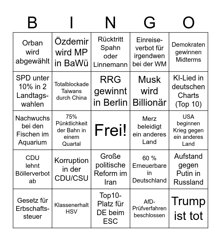 This bingo card has a free space and 24 words: Korruption in der CDU/CSU, Klassenerhalt HSV, RRG gewinnt in Berlin, Gesetz für Erbschafts-steuer, Demokraten gewinnen Midterms, Orban wird abgewählt, SPD unter 10% in 2 Landtags-wahlen, Özdemir wird MP in BaWü, Merz beleidigt ein anderes Land, Große politische Reform im Iran, Musk wird Billionär, Nachwuchs bei den Fischen im Aquarium, 60 % Erneuerbare in Deutschland, Aufstand gegen Putin in Russland, Totalblockade Taiwans durch China, AfD-Prüfverfahren beschlossen, USA beginnen Krieg gegen ein anderes Land, Rücktritt Spahn oder Linnemann, KI-Lied in deutschen Charts (Top 10), 75% Pünktlichkeit der Bahn in einem Quartal, Trump ist tot, CDU lehnt Böllerverbot ab, Einreise- verbot für irgendwen bei der WM and Top10- Platz für DE beim ESC.