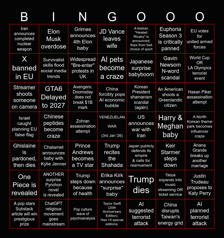 This bingo card has a free space and 48 words: Trump dies, Gavin Newsom N-word scandal, Taylor Swift (20th Anniversary Edition). Has >5 special editions., Chinese peptides become craze, Avengers: Doomsday does not break $1B mark, A North Korean theme park becomes influencer craze, Elon Musk overdose, ChatGPT religious movement goes mainstream, Euphoria Season 3 is critically panned, Trump recites the Shahada, EU votes for united armed forces, JD Vance leaves wife, An American shoots a Greenlandic citizen, Korean President shamanism scandal (again), One Piece is revealed, Harry & Meghan baby, X banned in EU, World Cup OR LA Olympics terrorist event, Tiktok expands into music streaming OR ticket service, A lesbian "Heated Rivalry" is announced; flops from bad choice of sport, Japanese surprise babyboom, Zohran assassination attempt, Iran announces completed nuclear weapon, Survivalist skills flood social media trends, Justin Trudeau proposes to Katy Perry, Widespread "Bre-enter" protests in UK, Hasan Piker assassination attempt, A pop stars Substack article will win prestigious prize, China forcibly pops AI economic bubble, GTA6 Delayed to 2027, China disrupts Taiwan's energy grid, US announces war with Iran, Ariana Grande breaks up another marriage, ANOTHER surprise Pynchon novel is revealed, Israel caught planning EU false flag, Japan publicly defends its empire & calls for rearmament, Keir Starmer steps down, Streamer shoots someone on camera, Prince Andrews becomes a TV star, Trump steps down because of health, Ghislaine is pardoned, then dies, AI planned terrorist attack, Grimes announces 4th Elon baby, Pop culture wave of psychoanalysis, AI pets become a craze, Erika Kirk announces "surprise" baby, Chalamet announces baby with Kylie Jenner and AI suggested terrorist attack.