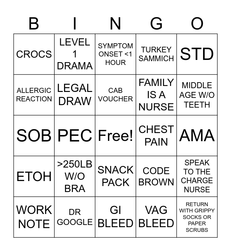 This bingo card has a free space and 39 words: PAIN >10, METHSQUITOES, OD, LEGAL DRAW, WORK NOTE, SNACK PACK, CAB VOUCHER, TIGER TEAM, STD, ETOH, PEC, TURKEY SAMMICH, RETURN WITH GRIPPY SOCKS OR PAPER SCRUBS, AMA, CHEST PAIN, >250LB W/O BRA, W/C ASSISTANCE, CROCS, DENTAL PAIN, CODE BROWN, ALLERGIC REACTION, GI BLEED, FAMILY IS A NURSE, MIDDLE AGE W/O TEETH, WORK NOTE, MVC, "HARD STICK", TATTOOS "I HATE NEEDLES", STEMI, LEVEL 1 DRAMA, RESTRAINTS, GLUCOSE >400, SYMPTOM ONSET <1 HOUR, DR GOOGLE, VAG BLEED, "IT'S IN THE COMPUTER", SPEAK TO THE CHARGE NURSE, SOB and "WHAT ARE WE WAITING ON".