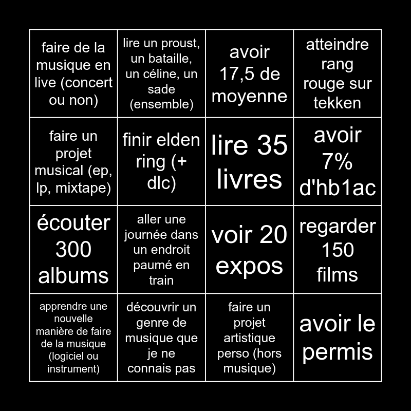This bingo card has 16 words: découvrir un genre de musique que je ne connais pas, regarder 150 films, avoir 17,5 de moyenne, faire de la musique en live (concert ou non), écouter 300 albums, lire un proust, un bataille, un céline, un sade (ensemble), voir 20 expos, faire un projet artistique perso (hors musique), faire un projet musical (ep, lp, mixtape), finir elden ring (+ dlc), apprendre une nouvelle manière de faire de la musique (logiciel ou instrument), atteindre rang rouge sur tekken, aller une journée dans un endroit paumé en train, avoir 7% d'hb1ac, lire 35 livres and avoir le permis.