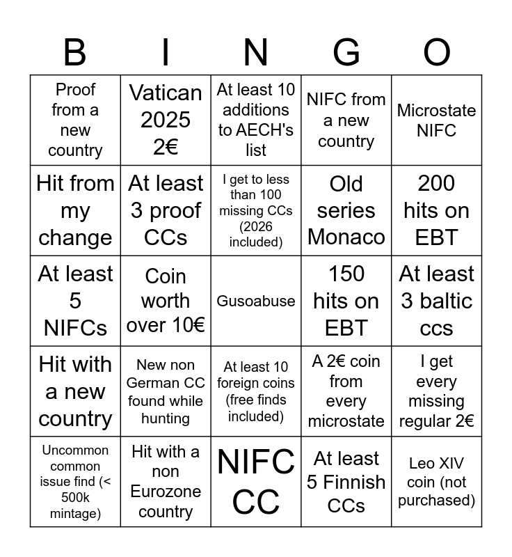 This bingo card has a free space and 24 words: New non German CC found while hunting, Hit with a non Eurozone country, I get to less than 100 missing CCs (2026 included), Uncommon common issue find (< 500k mintage), Microstate NIFC, Proof from a new country, Hit from my change, Vatican 2025 2€, 150 hits on EBT, At least 10 foreign coins (free finds included), Old series Monaco, At least 5 NIFCs, A 2€ coin from every microstate, I get every missing regular 2€, At least 3 proof CCs, At least 5 Finnish CCs, At least 3 baltic ccs, At least 10 additions to AECH's list, 200 hits on EBT, Coin worth over 10€, Leo XIV coin (not purchased), Hit with a new country, NIFC from a new country and NIFC CC.