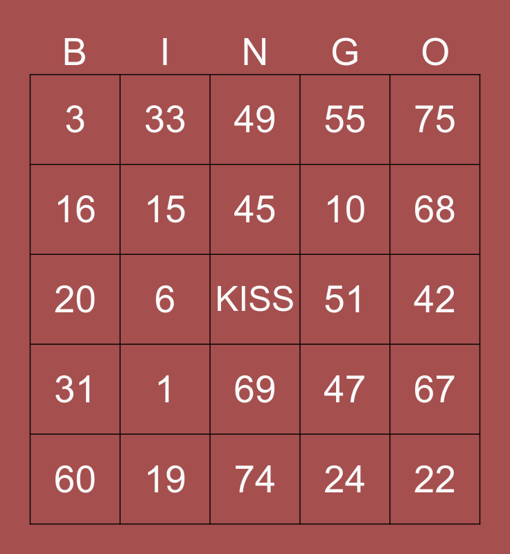 This bingo card has a free space and 24 words: 1, 19, 45, 60, 75, 3, 16, 33, 51, 69, 10, 20, 47, 67, 15, 24, 42, 49, 68, 6, 22, 31, 55 and 74.