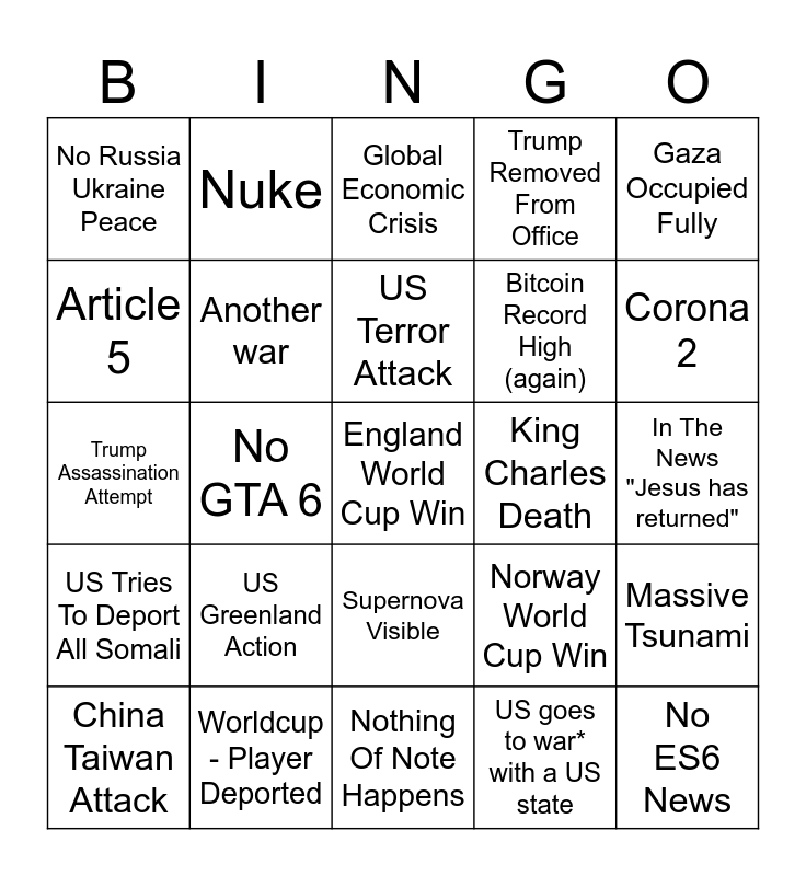 This bingo card has a free space and 24 words: US Greenland Action, Worldcup - Player Deported, US Terror Attack, China Taiwan Attack, Gaza Occupied Fully, No Russia Ukraine Peace, Article 5, Nuke, King Charles Death, Supernova Visible, Bitcoin Record High (again), Trump Assassination Attempt, Norway World Cup Win, Massive Tsunami, Another war, US goes to war* with a US state, In The News "Jesus has returned", Global Economic Crisis, Corona 2, No GTA 6, No ES6 News, US Tries To Deport All Somali, Trump Removed From Office and Nothing Of Note Happens.