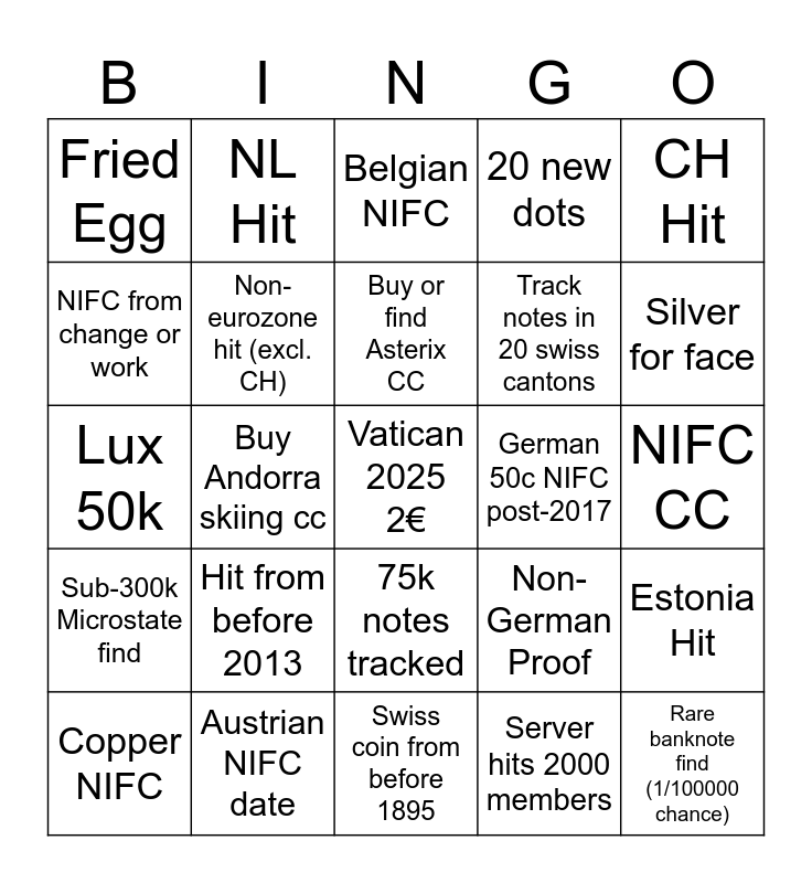 This bingo card has a free space and 24 words: Hit from before 2013, Austrian NIFC date, Buy or find Asterix CC, Copper NIFC, CH Hit, Fried Egg, NIFC from change or work, NL Hit, German 50c NIFC post-2017, 75k notes tracked, Track notes in 20 swiss cantons, Lux 50k, Non-German Proof, Estonia Hit, Non-eurozone hit (excl. CH), Server hits 2000 members, NIFC CC, Belgian NIFC, Silver for face, Buy Andorra skiing cc, Rare banknote find (1/100000 chance), Sub-300k Microstate find, 20 new dots and Swiss coin from before 1895.