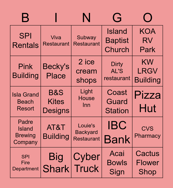 This bingo card has a free space and 24 words: AT&T Building, Big Shark, 2 ice cream shops, SPI Fire Department, KOA RV Park, SPI Rentals, Pink Building, Viva Restaurant, Coast Guard Station, Louie's Backyard Restaurant, Dirty AL'S restaurant, Isla Grand Beach Resort, IBC Bank, CVS Pharmacy, Becky's Place, Acai Bowls Sign, Pizza Hut, Subway Restaurant, KW LRGV Building, B&S Kites Designs, Cactus Flower Shop, Padre Island Brewing Company, Island Baptist Church and Cyber Truck.