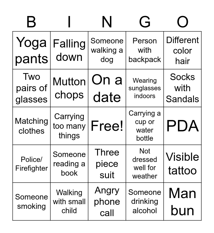 This bingo card has a free space and 29 words: Wearing blue shirt, Walking with small child, Someone walking a dog, Loud music in a car, Different color hair, Yoga pants, Mutton chops, On a date, Carrying a cup or water bottle, Visible tattoo, Someone smoking, Carrying too many things, Someone drinking alcohol, Man bun, Matching clothes, Walking with a cane, Angry phone call, Not dressed well for weather, Socks with Sandals, Police/ Firefighter, Someone reading a book, Terrible hat, Wearing sunglasses indoors, PDA, Two pairs of glasses, Falling down, Three piece suit, Person with backpack and Dropping things.