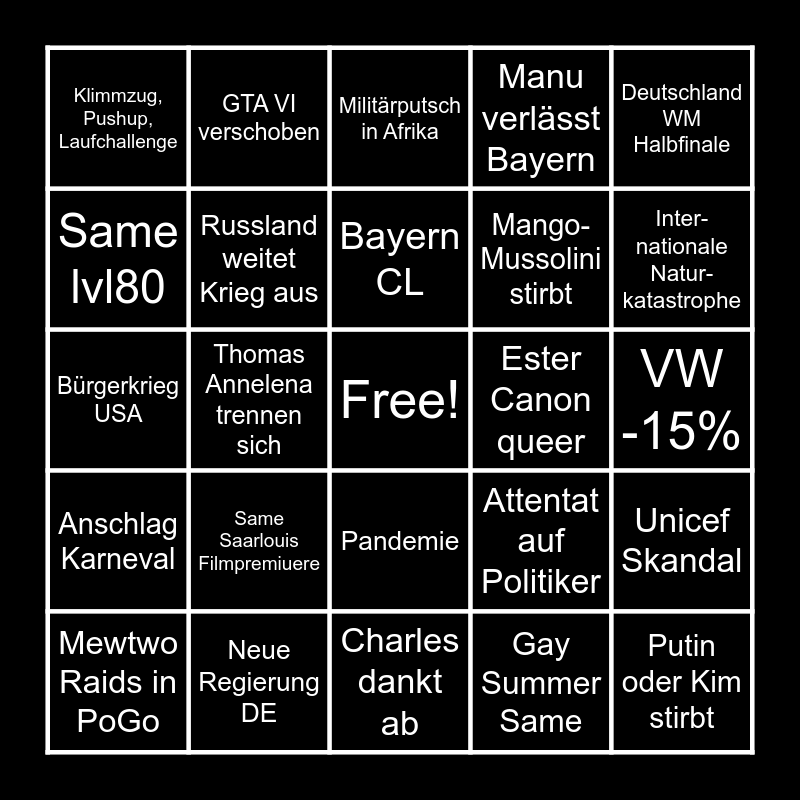 This bingo card has a free space and 24 words: Same Saarlouis Filmpremiuere, Neue Regierung DE, Bayern CL, Mewtwo Raids in PoGo, Deutschland WM Halbfinale, Klimmzug, Pushup, Laufchallenge, Same lvl80, GTA VI verschoben, Ester Canon queer, Pandemie, Mango-Mussolini stirbt, Bürgerkrieg USA, Attentat auf Politiker, Unicef Skandal, Russland weitet Krieg aus, Gay Summer Same, VW -15%, Militärputsch in Afrika, Inter-nationale Natur-katastrophe, Thomas Annelena trennen sich, Putin oder Kim stirbt, Anschlag Karneval, Manu verlässt Bayern and Charles dankt ab.