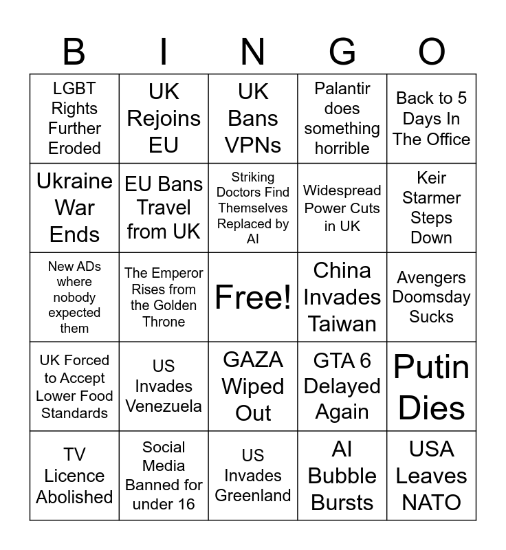 This bingo card has a free space and 24 words: US Invades Venezuela, Social Media Banned for under 16, Striking Doctors Find Themselves Replaced by AI, TV Licence Abolished, Back to 5 Days In The Office, LGBT Rights Further Eroded, Ukraine War Ends, UK Rejoins EU, China Invades Taiwan, GAZA Wiped Out, Widespread Power Cuts in UK, New ADs where nobody expected them, GTA 6 Delayed Again, Putin Dies, EU Bans Travel from UK, AI Bubble Bursts, Avengers Doomsday Sucks, UK Bans VPNs, Keir Starmer Steps Down, The Emperor Rises from the Golden Throne, USA Leaves NATO, UK Forced to Accept Lower Food Standards, Palantir does something horrible and US Invades Greenland.