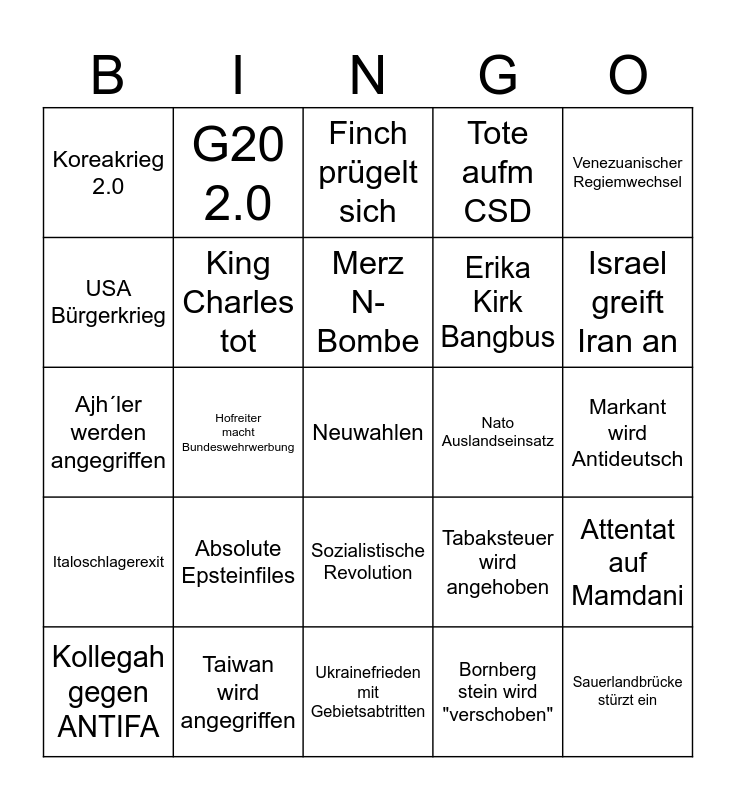 This bingo card has a free space and 24 words: Absolute Epsteinfiles, Taiwan wird angegriffen, Merz N-Bombe, Kollegah gegen ANTIFA, Venezuanischer Regiemwechsel, Koreakrieg 2.0, USA Bürgerkrieg, G20 2.0, Nato Auslandseinsatz, Sozialistische Revolution, Erika Kirk Bangbus, Ajh´ler werden angegriffen, Tabaksteuer wird angehoben, Attentat auf Mamdani, King Charles tot, Bornberg stein wird "verschoben", Markant wird Antideutsch, Finch prügelt sich, Israel greift Iran an, Hofreiter macht Bundeswehrwerbung, Sauerlandbrücke stürzt ein, Italoschlagerexit, Tote aufm CSD and Ukrainefrieden mit Gebietsabtritten.