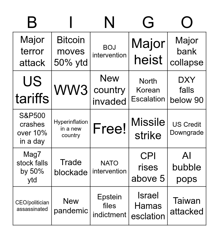 This bingo card has a free space and 24 words: Trade blockade, New pandemic, New country invaded, CEO/politician assassinated, Major bank collapse, Major terror attack, US tariffs, Bitcoin moves 50% ytd, Missile strike, NATO intervention, North Korean Escalation, S&P500 crashes over 10% in a day, CPI rises above 5, AI bubble pops, WW3, Israel Hamas esclation, US Credit Downgrade, BOJ intervention, DXY falls below 90, Hyperinflation in a new country, Taiwan attacked, Mag7 stock falls by 50% ytd, Major heist and Epstein files indictment.