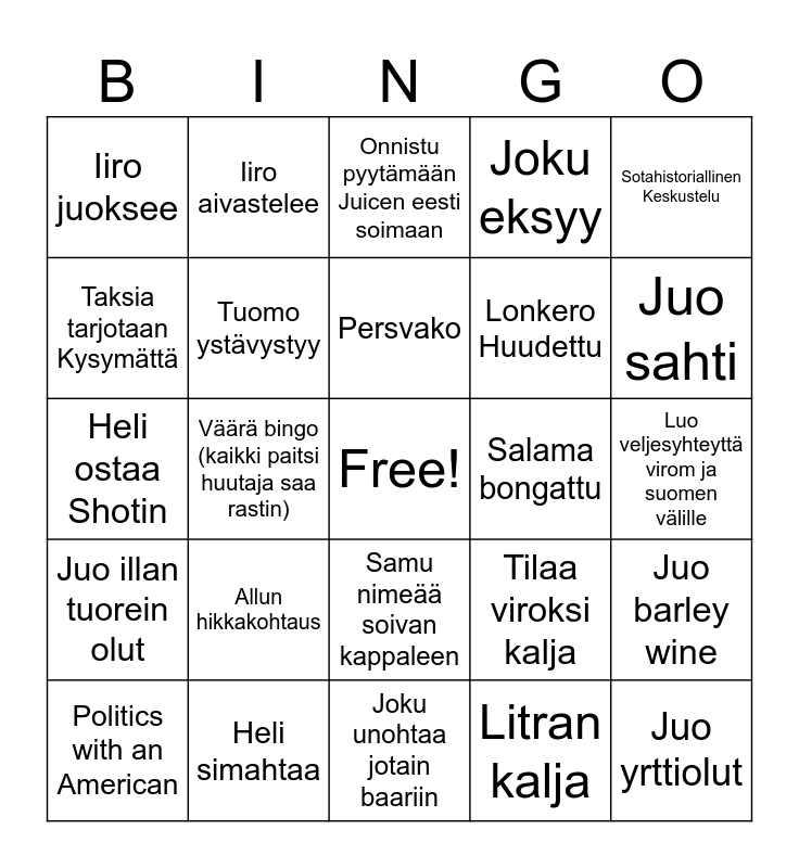 This bingo card has a free space and 24 words: Allun hikkakohtaus, Heli simahtaa, Persvako, Politics with an American, Sotahistoriallinen Keskustelu, Iiro juoksee, Taksia tarjotaan Kysymättä, Iiro aivastelee, Salama bongattu, Samu nimeää soivan kappaleen, Lonkero Huudettu, Heli ostaa Shotin, Tilaa viroksi kalja, Juo barley wine, Tuomo ystävystyy, Litran kalja, Luo veljesyhteyttä virom ja suomen välille, Onnistu pyytämään Juicen eesti soimaan, Juo sahti, Väärä bingo (kaikki paitsi huutaja saa rastin), Juo yrttiolut, Juo illan tuorein olut, Joku eksyy and Joku unohtaa jotain baariin.