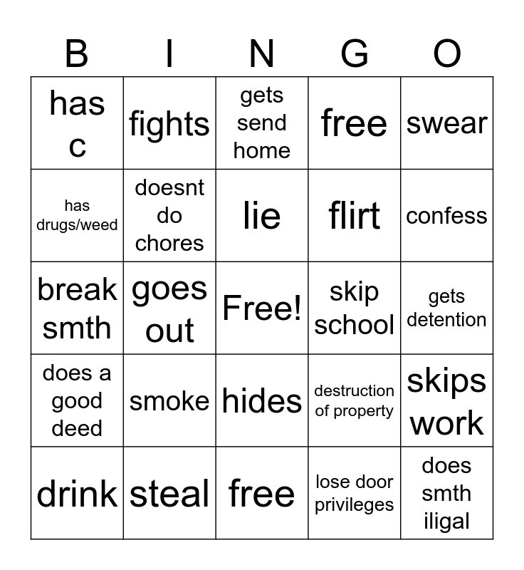 This bingo card has a free space and 24 words: smoke, steal, lie, drink, swear, has c, has drugs/weed, fights, skip school, hides, flirt, break smth, destruction of property, skips work, doesnt do chores, lose door privileges, gets detention, gets send home, confess, goes out, does smth iligal, does a good deed, free and free.